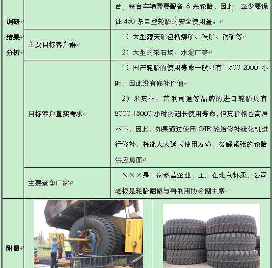 A公司总部在美国,于2012年下半年收购了一家意大利的大型工程轮胎修补机生产企业。2013年初,总部向全球多个分公司提出了在当地开拓大型工程轮胎修补机业务的要求,中国分公司市场部被授权对目标市场进行调研,初次现场考察后完成的报告如表2-6所示。