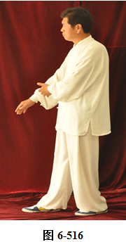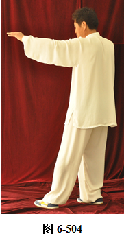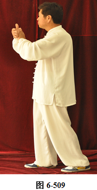 挤:腰向左外上提,身体微向左转,重心渐渐移于左腿。随转体右臂外旋,使掌心翻转朝里,左臂随身体向左转,外旋向左外挒。右小臂弧形垂肘横于胸前;左腰回转上提,身体回转,左手顺势搭在右手腕部,右掌心朝里,成右弓步。腰微拱向西北方向挤出,眼向前平视(见图6-508至6-509)。