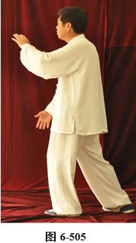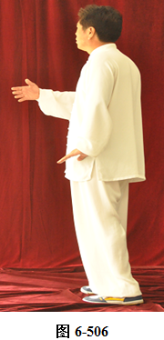 掤:右腰上提,右脚向前迈出,呈右弓步。腰继续上提,右小臂同时向右上前打掤,高与乳平。左掌下划置于左胯旁;意念领腰继续上提,右手掌随之向前上方撩,左掌跟随向上,当撩至略高于肩时,两掌翻转成掌心斜相对(见图6-506)。