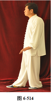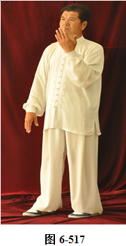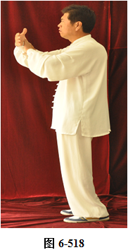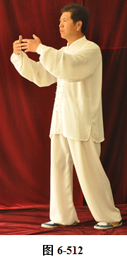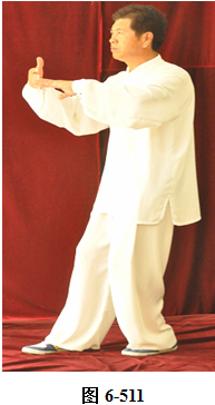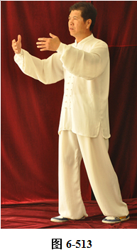 按:腰微含,右腰向右外平转,顺势拉开右手臂,左手指与右手指尖相对;左腰下沉上提,左手随即翻转呈横掌,左腰向左外平转,顺势拉开左臂,两手分开,间隔一横掌的距离。腰随即向后拱,重心落于左腿上,顺势两手翻转,手心向下,随身体后倚之势下按至腹前。腰上提 两臂随之向前上掤按推出,变右弓步。腰微后拱,左手翻转斜向里,指尖斜朝上,右手心斜向下,右手在上,左手在下,两掌心斜相对。随拱腰后倚之势,向右胯下捋;左腰向左外上提,左掌随向左外挒。身体随之转向正西,右臂随转上提收向胸前,掌心向内对正两乳间。右脚随之内转,脚尖稍向西南,重心落于左腿;左腰向右提,左脚跟向里微转,左臂顺势里翻,左手搭在右手腕部,重心落于两腿。腰微拱向前打挤(见图6-510至6-518)。