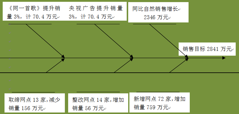 通过鱼骨图的方式,可以清晰地看到某区域要完成2841万元的下半年度的销售目标,分解出来的6个动作各自支撑了相对应的销量,是销售目标实现的重要保障。