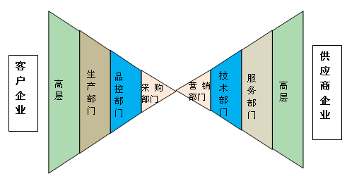 企业组织是由很多专业部门组成的复杂体系,而工业品具有技术复杂性,决定了客户关系也具有复杂性。在营销实践中,随着营销实践的深入,客户界面会发生各种各样的变化,根据国内工业品营销的大量案例的分析结果,客户界面大致分为三类,分别是蝴蝶形客户界面、三角形客户界面与菱形客户界面。