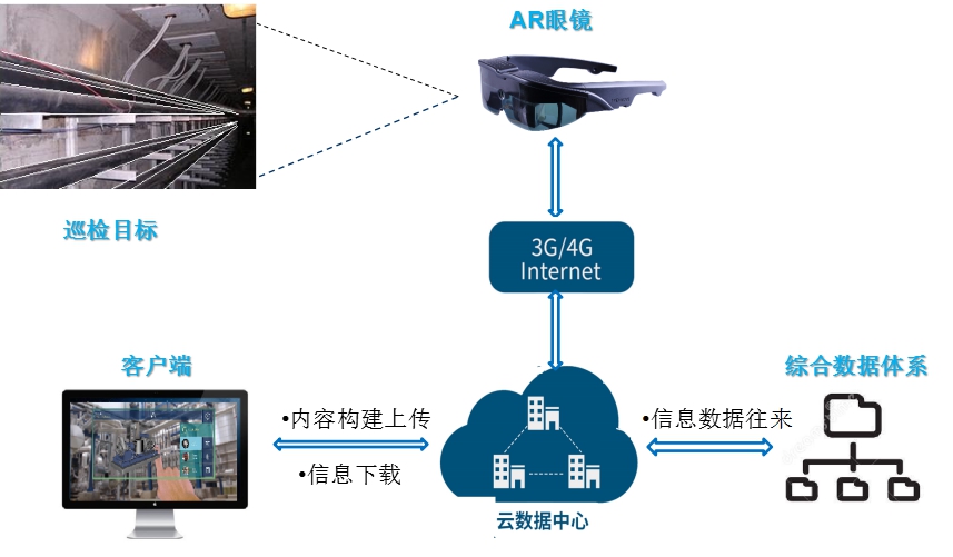 以AR(增强现实)眼镜为基本工具,结合相关的云平台计算和建模、定位技术、无线通讯、物联网识别技术等,定制开发相应AR端APP和基于云端的算法和数据支撑平台,最终实现电缆虚拟化透视巡检。