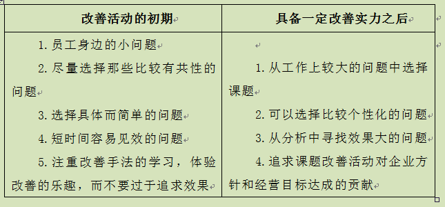 当然,在改善活动的不同时期,选择课题时需要考虑的因素会有些不同。如表4-9所示,改善活动的初期与有一定改善实力之后的情况作比较,它们之间的区别也是比较容易理解的。