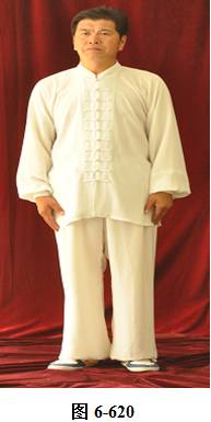 接上式,腰微微向左右两侧撑,随撑随里外转腕,使双手心朝外,平拉按开,与肩平宽;腰缓缓下沉,微后倚,带动两手缓缓向前下按,似凭栏下望。一直下落按于胯前 随即自然垂于胯两侧, 眼神自然向内收敛(见图6-619至6-620)。