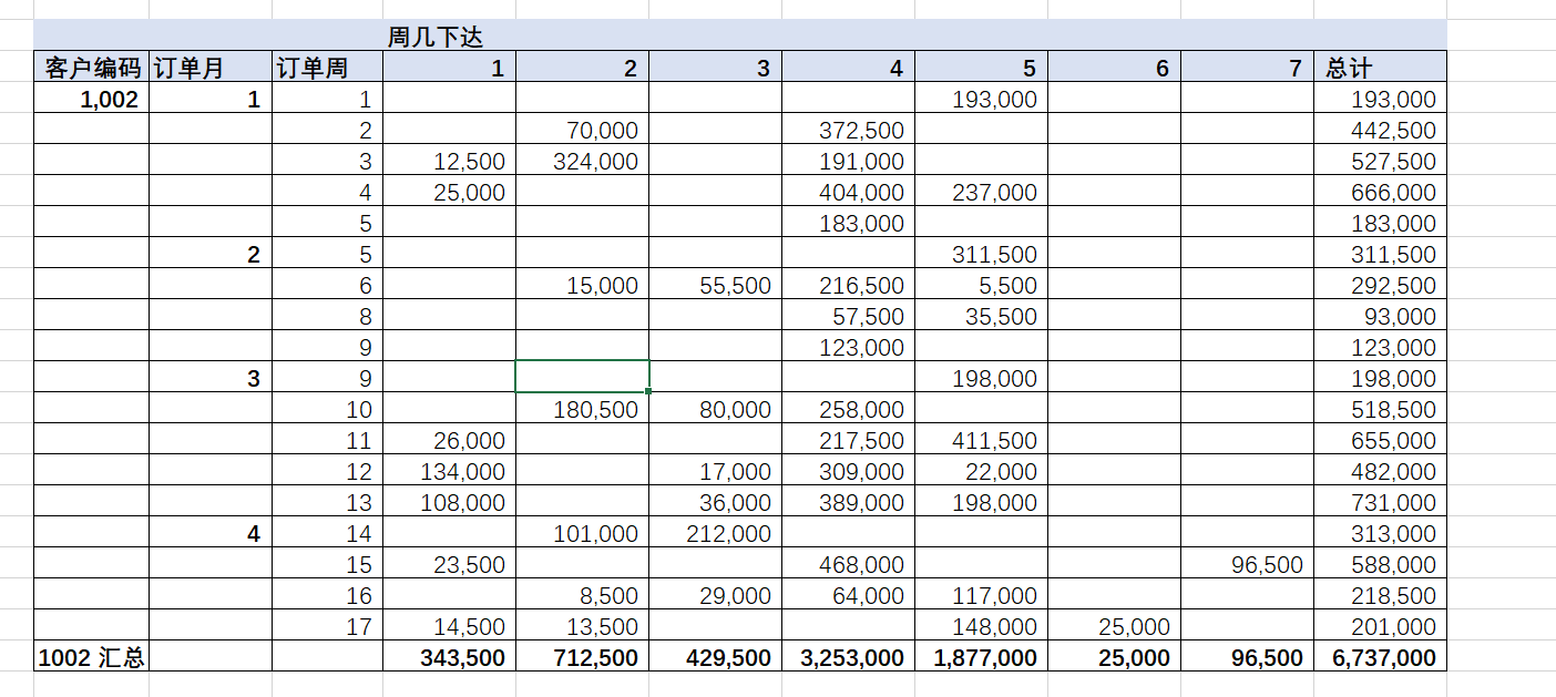 其次,需要进行单个客户的订货模式分析。这里主要从客户订货频次和订货交期分布来进行分析。在表4-10中插入周几一列,用WEEKDAY 函数,可以得到客户下单是周几;然后插入交付天数一列,用客户要求交期-订单下达日期就可以得到。