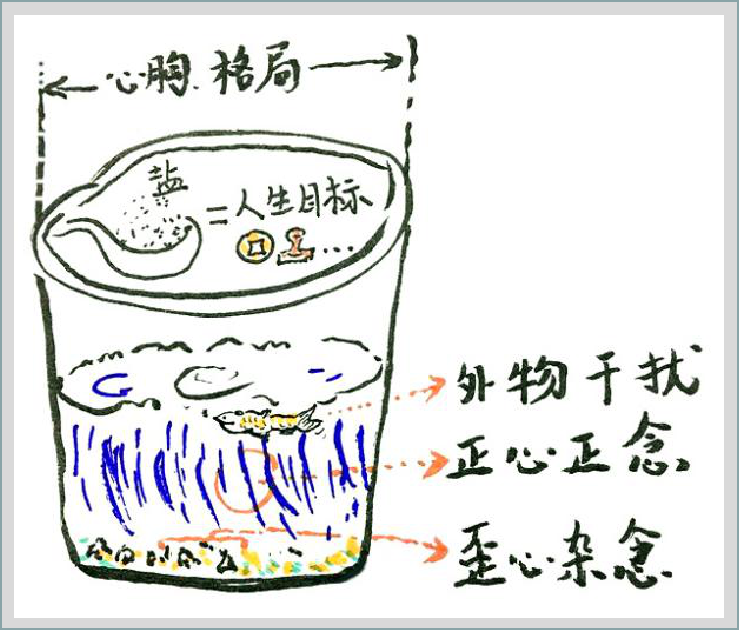 文字工作中的禅,就在于把所有的字都看成有脸谱、有性格、有灵魂的士兵。他们潜藏于你的大脑,甚至游走于虚空。你需要他们的时候,他们就会第一时间出现、集结。好似一杯装有各种溶解物或杂质的水,在动荡的环境中沉渣泛起、一片浑浊,很难透过它洞穿外面的世界。如果静下来,内外兼修地静下来,水变清澈了,世界的倒影或折射就能清晰呈现(见图8-2)。