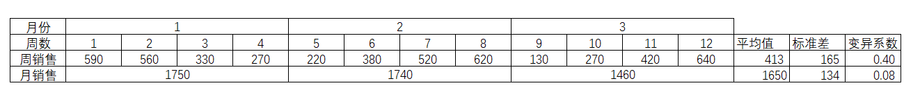 如图2-14例中,一月的销售是1750,其中第1和第2周需求强大,均超过500,而3和4周则销售下滑,不过要是以月为备货单位,那么只要备货足够1750就可以了。