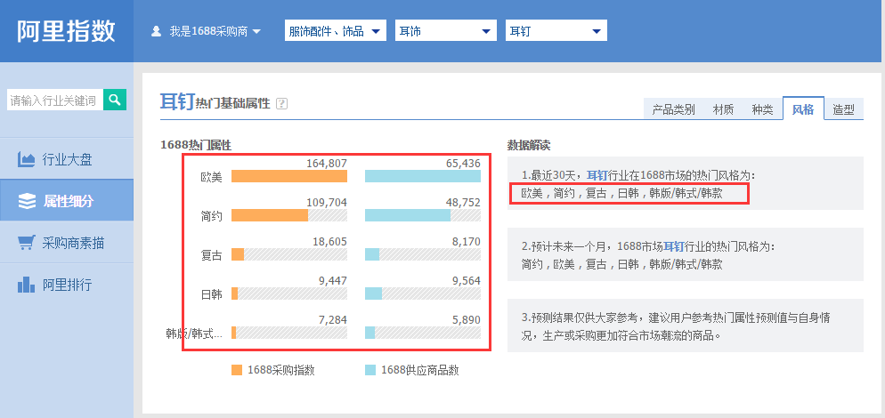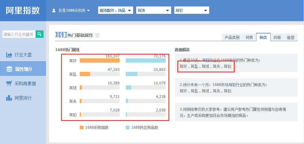我们来看阿里指数里面的属性细分,得出:30天耳钉行业类别为耳饰。如图1-5所示。