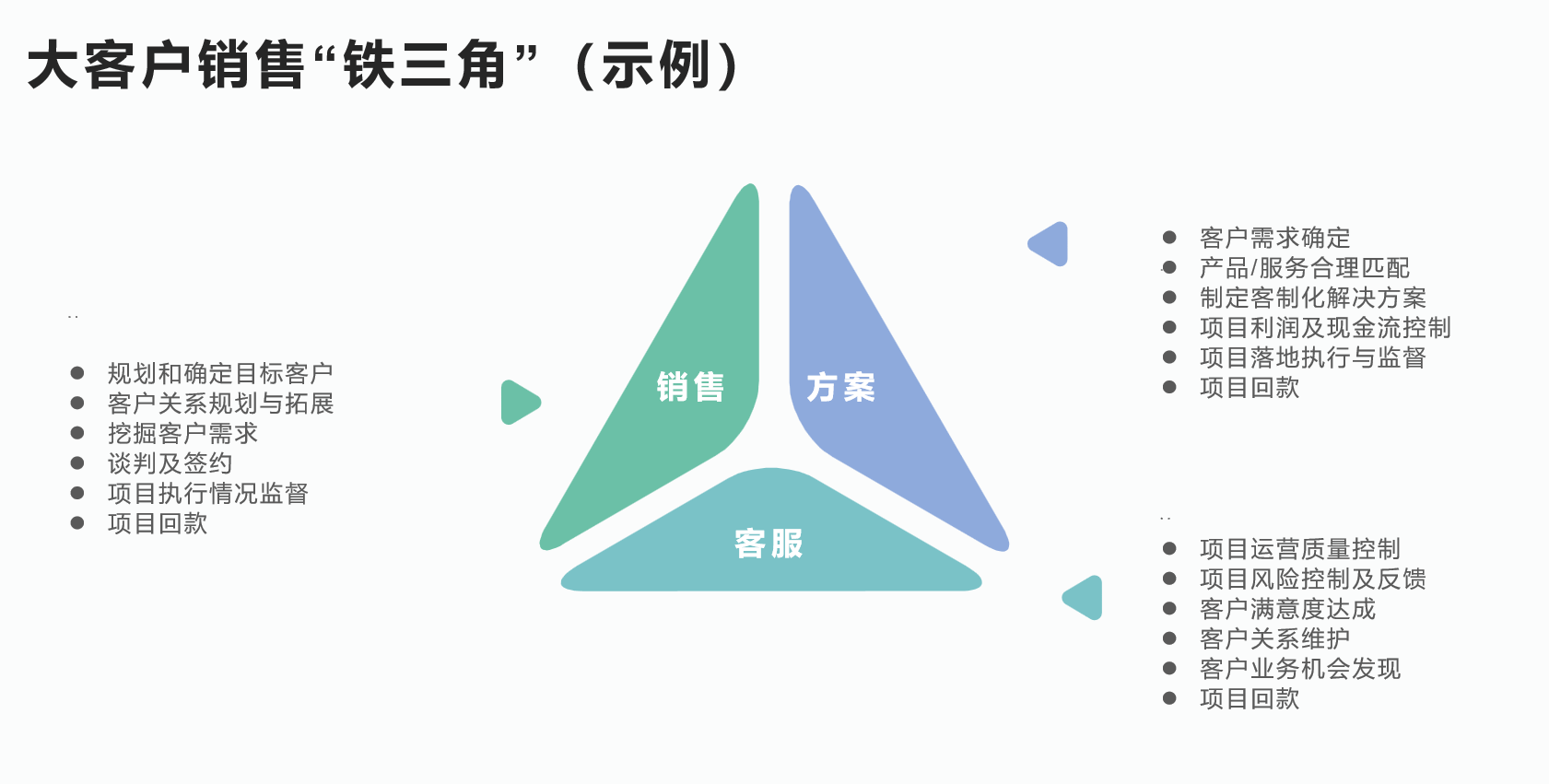 “一个篱笆三个桩,一个好汉三个帮”,我们要把客户的需求按照他的购买流程进行拆解。比如在“确定需求”阶段主要谈需求,我们就让善于做客户关系,能和客户无话不谈的“销售”出马,挖掘并确定客户的真实需求;到了“评估方案”阶段,我们以“熟悉公司产品,能够定制化解决方案”的“方案”人员主导,为客户打造定制化的方案,又能使公司的利益最大化;在“评估风险”阶段,“销售”为主导消除客户顾虑;到了最后的“合同执行”阶段,懂售后、盯运营的“客服”人员就要走到台前。