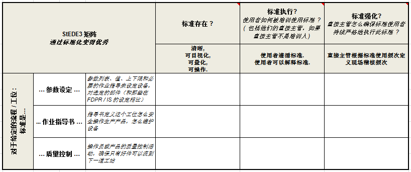 九宫格1.参数设定标准 | 根据生产产品型号,查看工艺卡或者标准卡关于机台参数设定的标准 | 描述清晰,项目齐全,无遗漏; 可视的,看得见的,读得懂的; 量化,有中值、公差,或者定义了范围;可操作,公差合理,范围合适,数据证据 |
