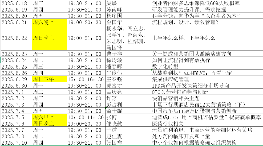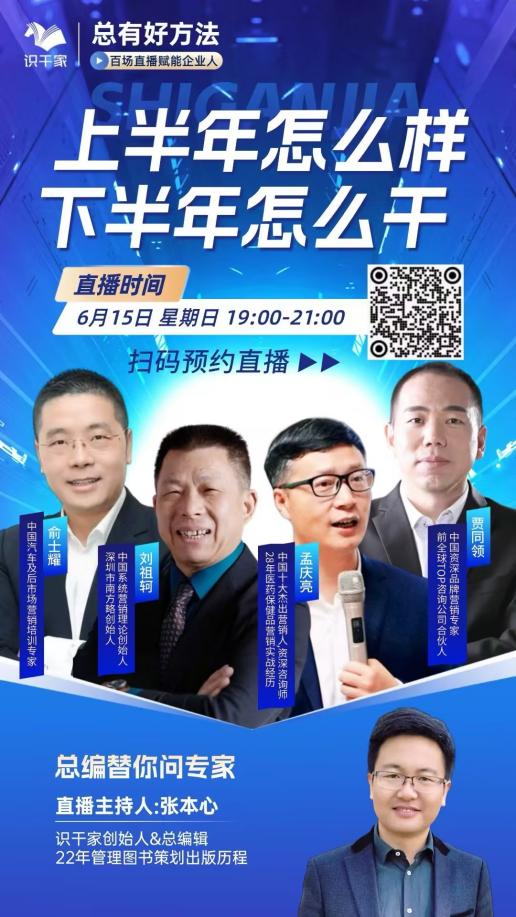 四位专家从自己所在的行业出发,深入剖析了B2B、医药、建材家居、汽车行业上半年发展的情况,并给下半年的发展给出了可落地的实战方法。识干家年中直播特别策划第二期将于下周日6月22号晚7点开播,来自白酒,快消,产业园区,渠道建设,大客户销售,生产制造等各领域的8位专家将继续跟大家分享!欢迎大家持续关注!