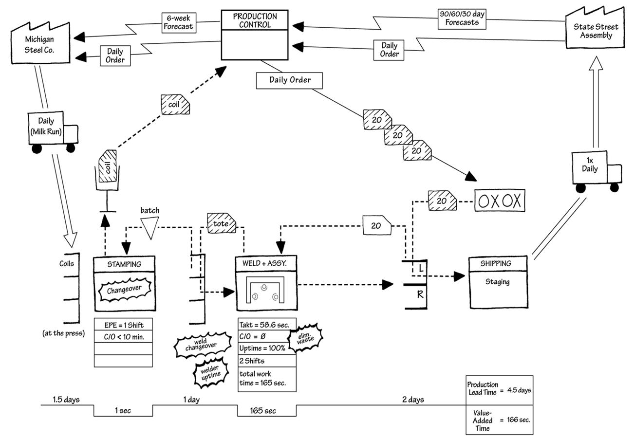 根据改善计划,按上面步骤在白板上画出改进后的价值流程图,未来价值流程图示例如图7-8所示。