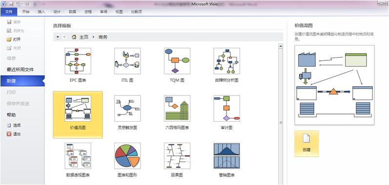 可采用EXCEL或Microsoft Visio,此软件画价值流程图较方便。安装后点击打开此软件,选择“商务”,在选择模板中点击“价值流程图”,如图7-9所示。