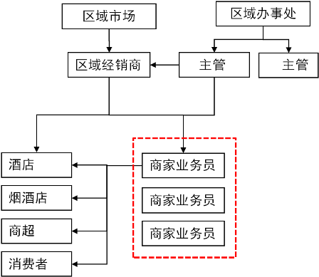 产品多以快速消费性质的中低端酒为主,通过大传播、大流通的方式操作市场。区域市场设置了配送商、各区域的经销商、小区域的分销商。区域办事处以区域分销商为单位配置业务人员,管控小区域分销商的出货及库存,维护终端和开展消费者促销活动,协助分销商出货。在整个品牌的渠道链中,渠道商基本为配送商,厂家则成为市场运营的主体。