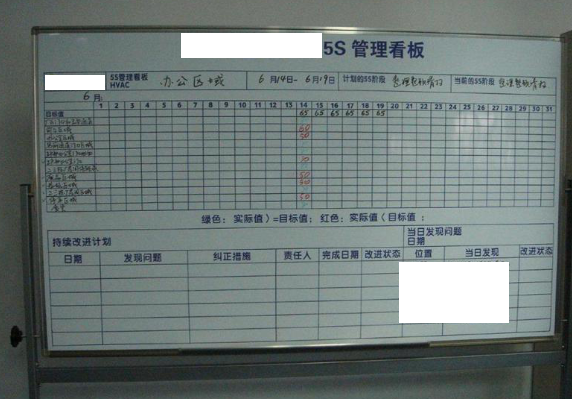整个工厂被分成大区域,每个区域设置一块看板,对于每个检查区域由相关的负责人按照检查表进行审核并打分,把打分的结果公布到管理看板上,每天公布发现的问题和责任人,并且就暂时不能解决的问题给出行动计划,包括行动的内容、完成时间和责任人。