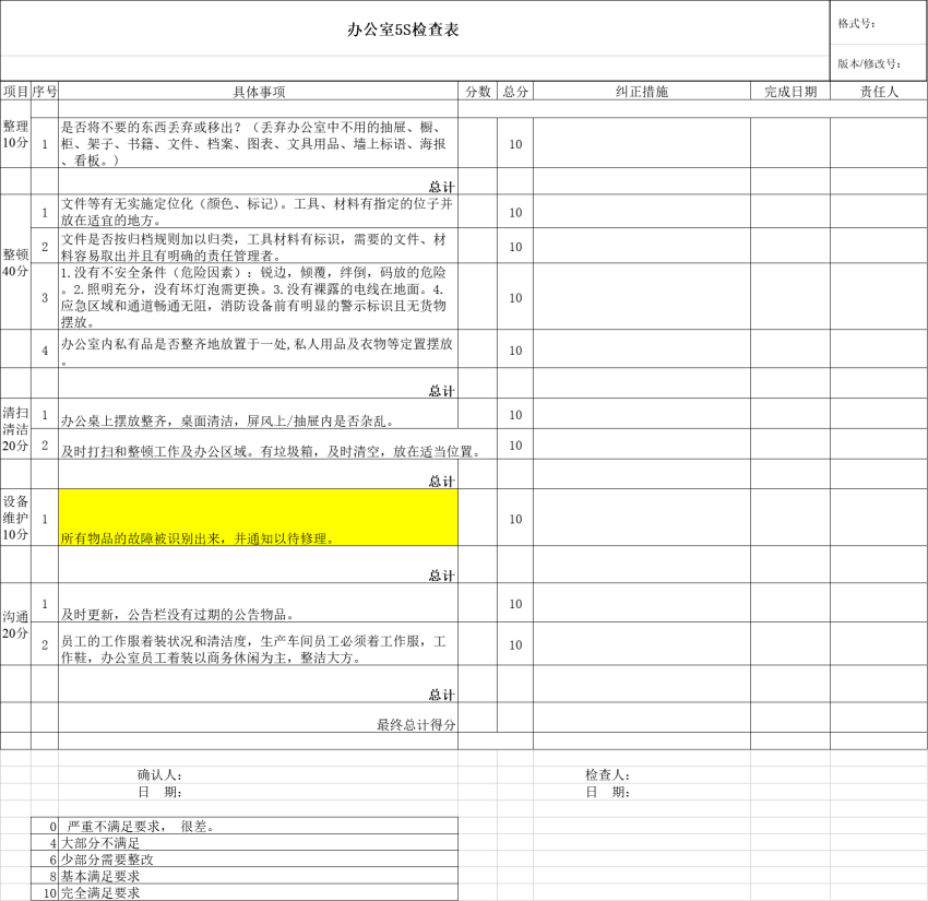仓库、办公室、车间,根据5S的要求,对各个区域建立检查清单。由于每个区域的情况不同,我们分别建立了仓库、办公室和车间的5S检查清单。