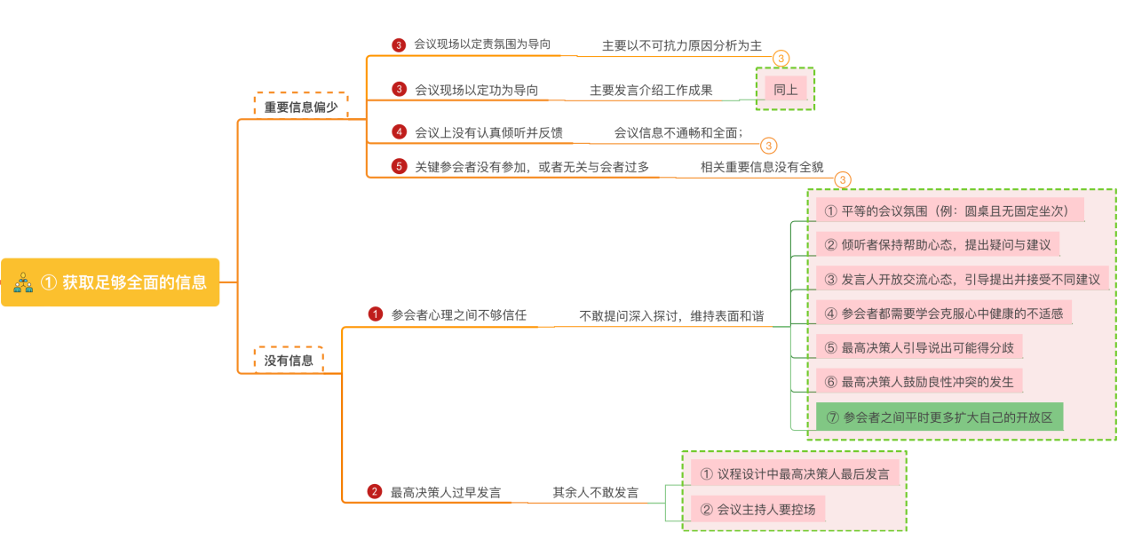 了解完现象①的解决方法,现在我们来看导致会议过程中没有信息出现的现象②:会议最高决策人习惯过早发言,长期抑制团队思考探讨的能力。