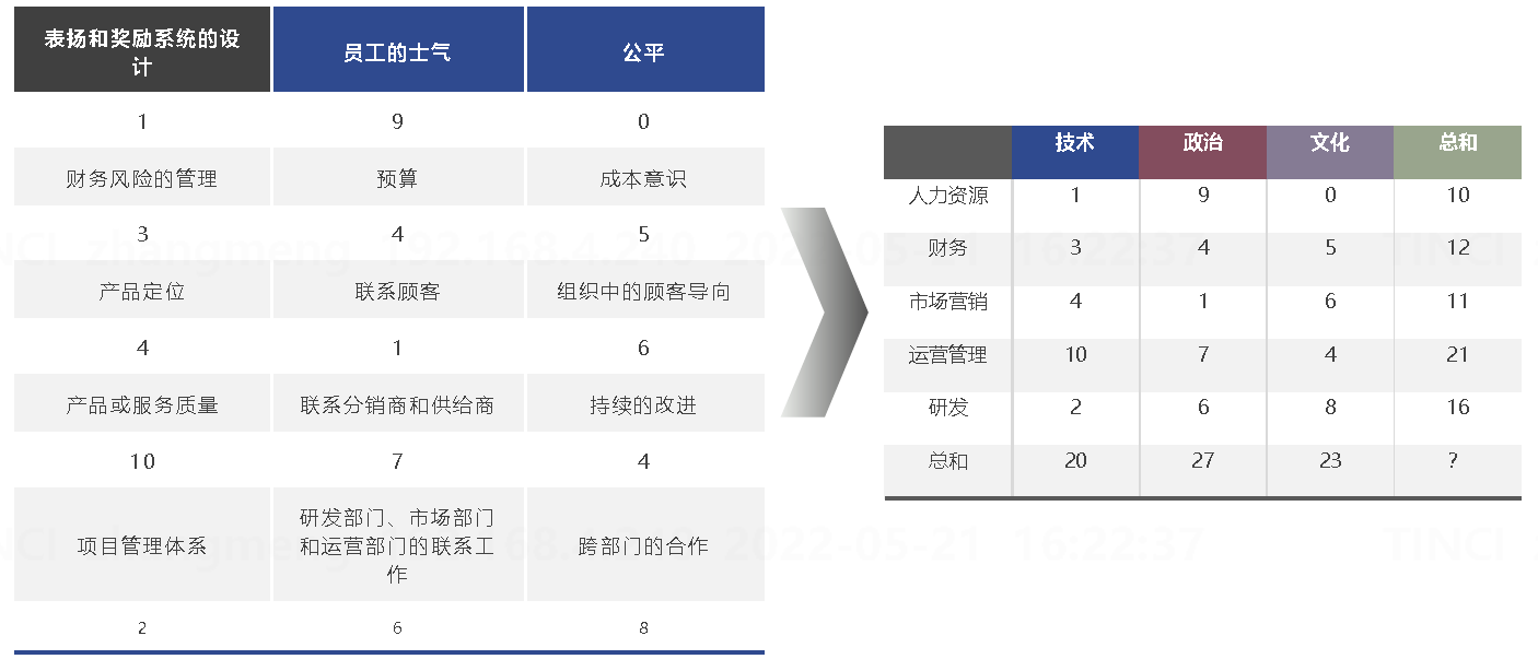 对于评估转身员工的优劣势,可以使用问题偏好测评法。问题偏好测评法是指从岗位的职责出发识别关键业务活动,如财务风险管理、团队激励设计、组织顾客导向分析,并将业务活动转化为员工评分指标,最后根据员工评分结果得出员工解决问题的偏好,进一步匹配到现有岗位员工所需的技能哪些是要做快速提升,以及在将来决策时需要警惕的。如图7-2所示,对于一个综合型岗位,我们在问题偏好上从人力资源、财务、市场营销、运营管理、研发的五个业务活动中分别就技术、政治、文化上分别设置了偏好测评指标,并从测评结果中发现测评员工在团队人力资源管理的技术手段及文化打造中亟须提升,且在顾客联系、财务风险管理上关注度不足,在未来决策中需要重点关注。