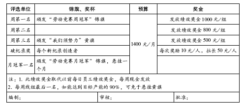 第二,实施组装车间的劳动竞赛方案,提升组装车间的人均小时产量。组装车间劳动竞赛方案如下文: