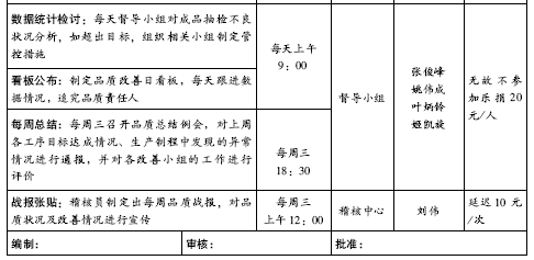 (2)过程奖惩:根据改善结果,由总督导人每周评出“品质改善之星”,报总指挥审批,对小组组长奖励50元/人,小组成员奖励20 元/人(在各工序品质考核目标未确定之前暂不实施)。