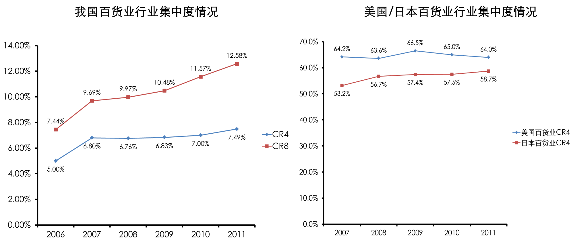 图1-2 中国百货行业集中度(左)美国/日本百货行业集中度(右)