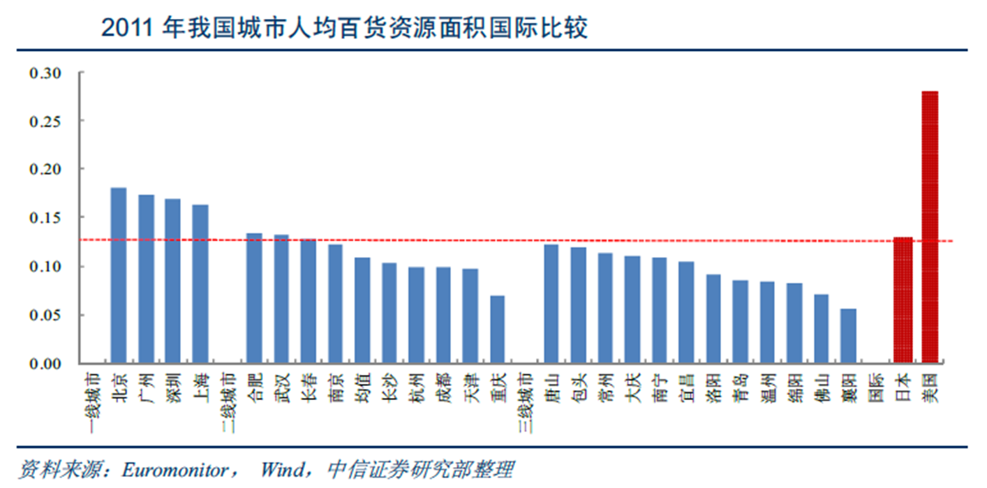 图1-5 中国各区域城市人均百货资源面积与国外对比