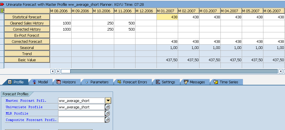 SAP的统计预测界面如图3-2统计预测,计划员可以选择不同的统计预测模型,此处选择的是AVERAGE SHORT模式,就是过去4个月的平均值。