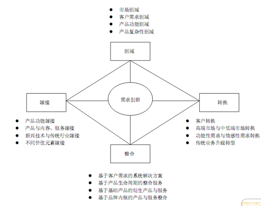 “删减”包括市场删减、客户需求删减、产品(包括服务,下同)功能删减、产品复杂性删减四条细分路径;“嫁接”包括产品功能嫁接、产品与内容/服务嫁接、新兴技术与传统行业嫁接、不同价值元素嫁接四条细分路径;“转换”包括客户转换、高端市场与中低端市场转换、功能性需求与情感性需求转换、传统业务升级转型四条细分路径;“整合”包括基于客户需求的系统解决方案、基于产品生命周期的整合服务、基于基础产品的衍生产品与服务、基于品牌内核的产品与服务整合四条细分路径。