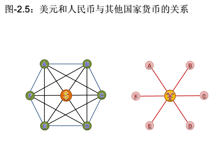 鉴于当年美国所处的绝对优势地位,其建立布雷顿森林体系时自然可以采取高屋建瓴式的顶层设计,一步到位把美元放到了国际货币的位置上,形成了以美元为核心与各国货币的全方位多边网状结构;而中国在推行“一带一路”战略的过程中只能采取渐进式办法,分别与各贸易关系国互换货币进行结算,然后凝聚诸多双边关系最终形成以人民币为核心的星状结构。