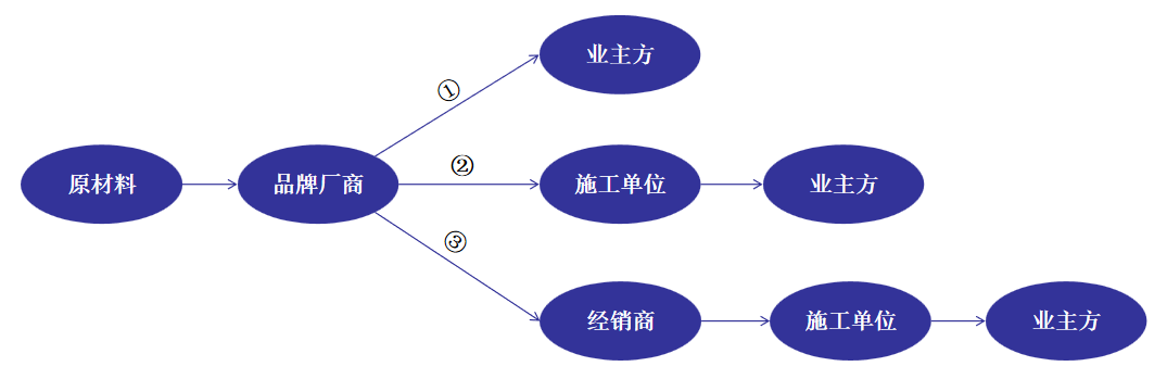路径①则是甲供材,由业主方制订采购计划并直接采购,品牌厂家与业主方直接结算。