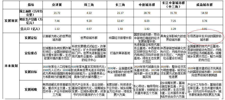 根据各城市群发展现状及未来规划对比,成渝城市群定位为引导西部开发开放的国家级城市群,规划2020年基本建成。