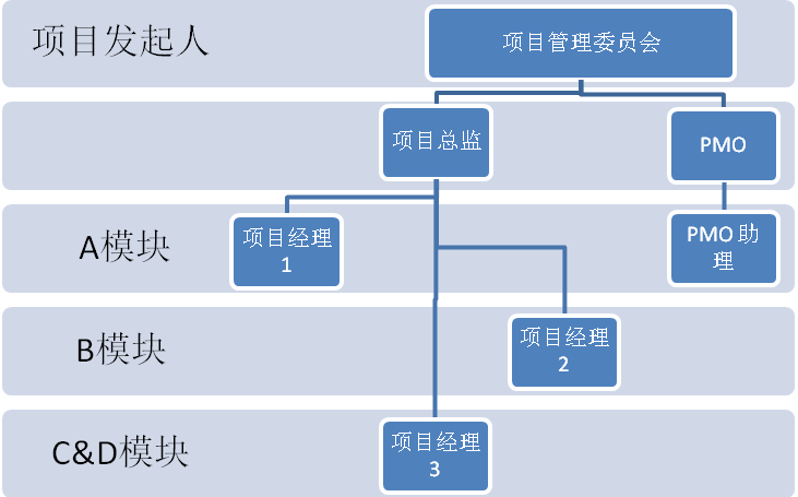 上述的模拟情形描述了一个场景,高层(项目发起人)开始做顶层设计,并搭建项目的治理架构。一是以通过委任项目总负责人作为授权人;二是独立地设立PMO为项目提供支持。