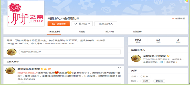 (5)利用微话题吸粉。通过微博创建微话题,每次在发微博的时候,可以在关键词前后增加“##”,比如“#肌护之亲团队#”,那么“肌护之亲团队”就是一个微话题,你就是这个微话题的主持人,可以管理这个话题,并且可以设置正反观点让话题观众进行投票。此外,还可以设置转发有礼活动。这样别人在发布“肌护之亲团队”这个关键词的时候就会第一时间进入你的微话题,那么你的信息和联系方式也会第一时间展示在对方面前,从而达到极高曝光率和吸粉的作用。
