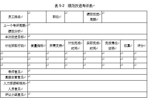 员工自评的数据收集以员工自行收集为主,必要的时候可以向直接主管求助,以便获取真实、有效的数据。在提交自评的时候,对于一些关键事项可以提交相关的作业文档作为支撑性说明文件。绩效改进考评表基于绩效改进计划表的信息进行拓展,如表 5-2 所示。