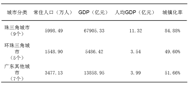 珠三角和环珠三角及广东其他城市差别较大,珠三角9市人均GDP是其它区域城市的3倍以上,而珠三角9市城镇化率则高出其它区域35个百分点,差距巨大;