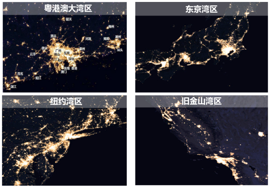 从卫星灯光图看,世界四大湾区城镇和人口集聚程度极高,且沿海岸呈带状分布,湾区内均有领先的世界级城市。