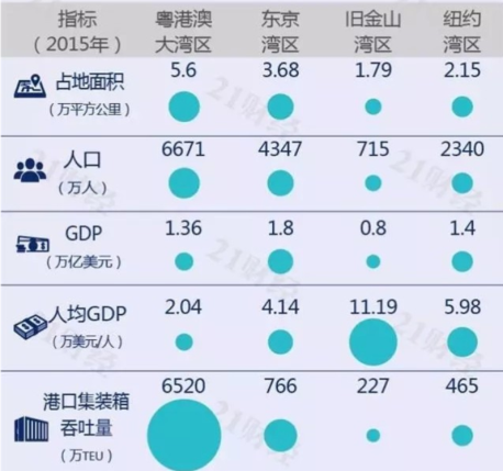 从人口和经济等指标看,粤港澳湾区的占地面积最大、人口最多,经济总量在东京湾区之后,位列第二,但人均GDP仅为东京湾区的1/2,纽约湾区的1/3,旧金山湾区的1/6。