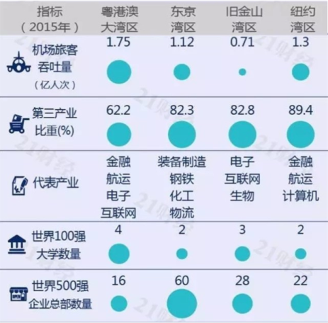 从交通运输和产业发展等指标看,粤港澳湾区的机场和港口吞吐量均位列第一,产业发展突出金融、航运、电子、互联网等产业,但世界500强企业总部均少于其它湾区,经济活力有待培育提高。