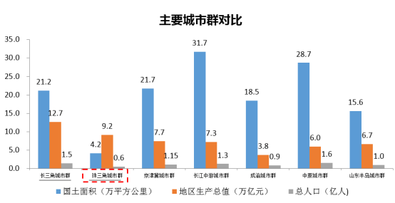珠三角城市群国土面积4.2万平方公里,占全国的0.44%;地区生产总值9.2万亿元,占全国的10.87%;常住人口0.6万亿人,占全国的4.34%。珠三角城市群与我国其余两个世界级城市群对比,国土、人口以及地区生产总值均最低。这种差距不仅体现在经济总量数据上,区域间城市发展水平不均衡等问题。