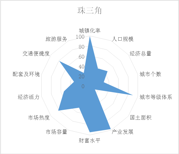 从城市群投资潜力雷达图可以看出,珠三角城市群的人口、经济、城市个数等规模较小,但城市等级体系、产业发展、财富水平、交通便捷度城镇化率和房地产市场热度比较高。
