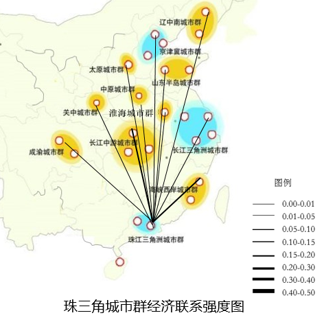 从城市群经济联系强度图可以看出,珠三角城市群与长江中游城市群和海峡西岸城市群联系最为密切,其次与中原城市群、成渝城市群、山东半岛、京津冀城市群联系较为密切。