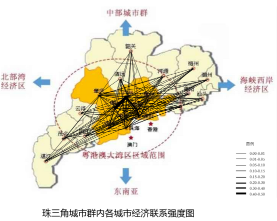 从珠三角城市群经济联系强度图可以看出,广州和佛山(2.1309)联系最为密切,其次广州和东莞(0.2861)、深圳和东莞(0.2034),广州和深圳(0.1429)等城市联系较为密切。