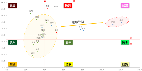 根据九宫格阶梯筛选法则,处在阶梯阴影区为重点拓展城市; 黄线框内的重点拓展城市,主要包括珠三角的肇庆和广东其他区域的河源;重点关注肇庆,肇庆人口410万,GDP超过2000亿,整体供需平衡且涨幅不大,紧邻珠三角核心区的规划新区,具有较大发展空间;挑货区重点拓展城市有云浮、潮州、韶关;湛江、惠州处在快销区,应注意防控风险。