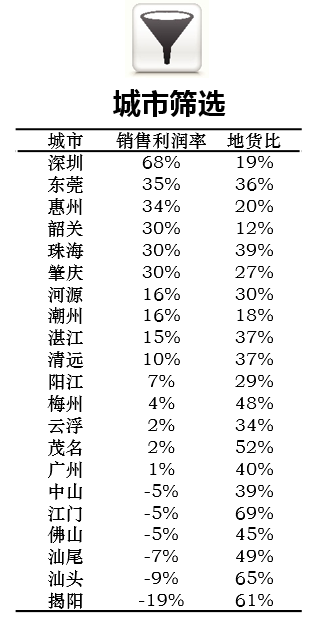 以市场化公司一般选取的投资评审标准作为筛选器,中山、江门、佛山、汕尾、汕头、揭阳城市销售利润率为负,除战略考量外,能不进驻则不进驻;清远、阳江、梅州、云浮、茂名、广州城市平均销售利润率低于15%,应关注市场风险,重点把控好获取土地位置及价格。