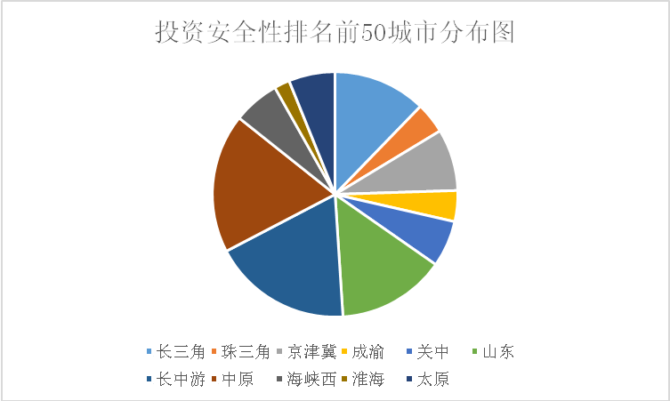 我们对房地产投资安全性前50名城市所属城市群进行了统计分析,长江中游城市群、中原城市群分别占9席,居各城市群之首;山东半岛城市群占7席,长三角城市群占6席,居城市群投资安全第二梯队。