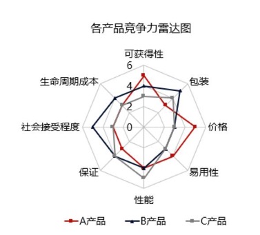 图4-52 各产品竞争力雷达图 第四步,识别差距和优劣势。在雷达图中,我们可以了解到:A产品在可获得性、价格、易用性方面表现较好,但其他方面表现较弱,其中包装和保证劣势明显。 第五步,在识别出A产品与竞争对手的优劣势之后,某某光电就可以制定针对性的竞争策略,扬长补短。 A产品在可获得性、价格与易用性方面的表现更好,某某光电需要继续保持这种优势。而为了弥补产品劣势,某某光电制定了系列策略:强化A产品的包装和外观设计,既强调实用性,又要契合目标客户的风格偏好;强化产品的售后服务,承诺3个月内免费更换;提升显示屏集成技术并采购性能更好的芯片,提高LED显示屏的性能;创造性地提出租赁屏的概念,降低客户使用的生命周期成本;增强销售投入,促进产品的品牌推广。 企业的产品和服务并不是生产出来给自己用的,而是给客户用的。因此,就要求企业必须时刻保有“客户思维”,从客户需求的角度来审视自身产品的竞争力。通过与竞争对手的比较,识别自身产品的优劣势,进而极具针对性的采取竞争策略,扬长补短,不断提高自身产品的核心竞争力。 |