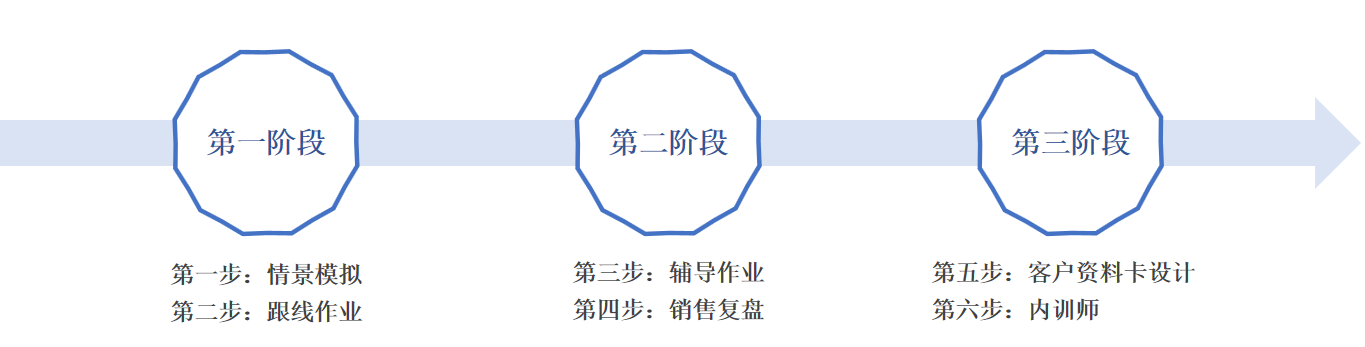 当员工已经经过情景模拟和跟线作业的考核之后,我们就进入了第二阶段,和第一阶段的两个步骤同样,第三步辅导作业和第四步销售复盘也是一起进行应用。