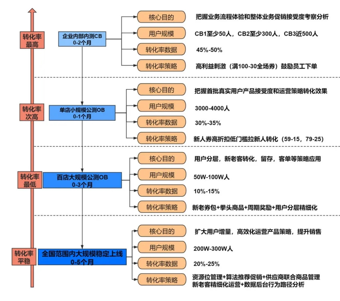 线下强大的资源优势需要有效的转化策略模型复制,在制定系列运营流程模式后在CB(内测)阶段反复A&B Test,从促销到优惠券,商品到下单流程,并尝试拿到ROI最高策略形式。