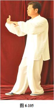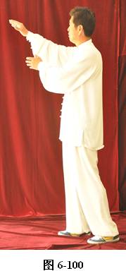 接上式,腰微拱,重心渐渐移至左腿,右手随重心转移向左下腹划弧捋至左肋旁。手心翻转向上,左手随腰拱,向外上方划弧翻转掌心向下,高与肩平,成左抱球状。右腰上提,右脚随即向前迈出小半步,右手臂上翻向前打掤(见图6-100至6-107)。